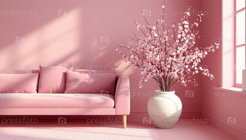 Элемент минималистского дизайна - цветы в больших вазах на фоне стены розовых тонов