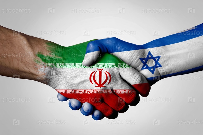 Сильное рукопожатие обеими руками с флагами Израиля и Ирана - это концепция прекращения огня на Ближнем Востоке