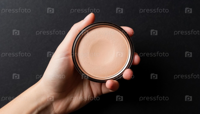 Бежевый косметический порошок на ладони женщины на черном фоне