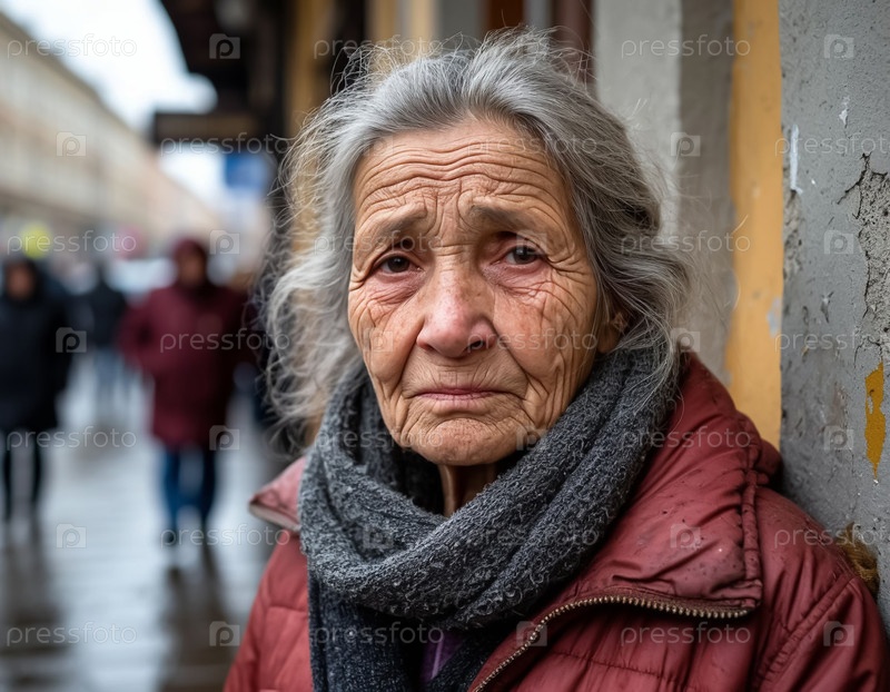 Бедная одинокая бабушка в городе, ближайший план.Созданный искусственным интеллектом
