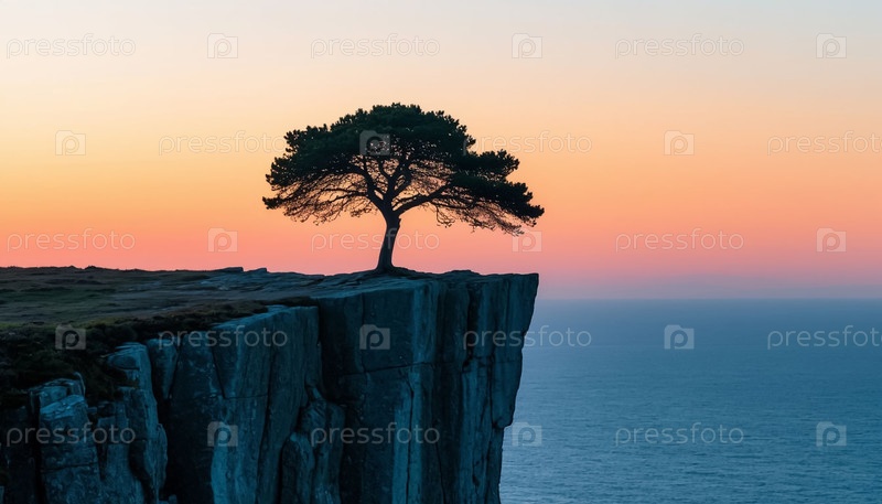 Одинокое дерево на крутой скале среди туманного утра