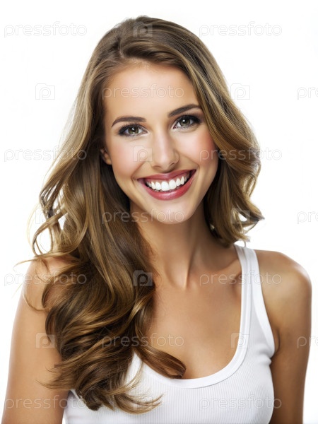 Красивая молодая женщина улыбается в белой майке на белом фоне