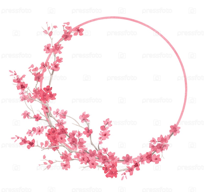 венок из вишневых веток на розовом кольце. иллюстрация ручной акварели. для ткани, обоев, поздравительных открыток, дизайна, декора и иллюстраций