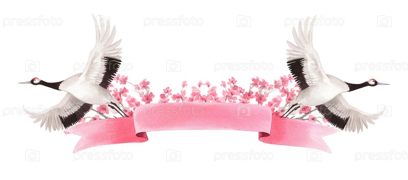 Баннер с изображением японских краснокоренных журавлей, вишневых веток и лент. Илюстрация ручной акварели для ткани, обоев, поздравительных открыток, дизайна, декорации и иллюстраций