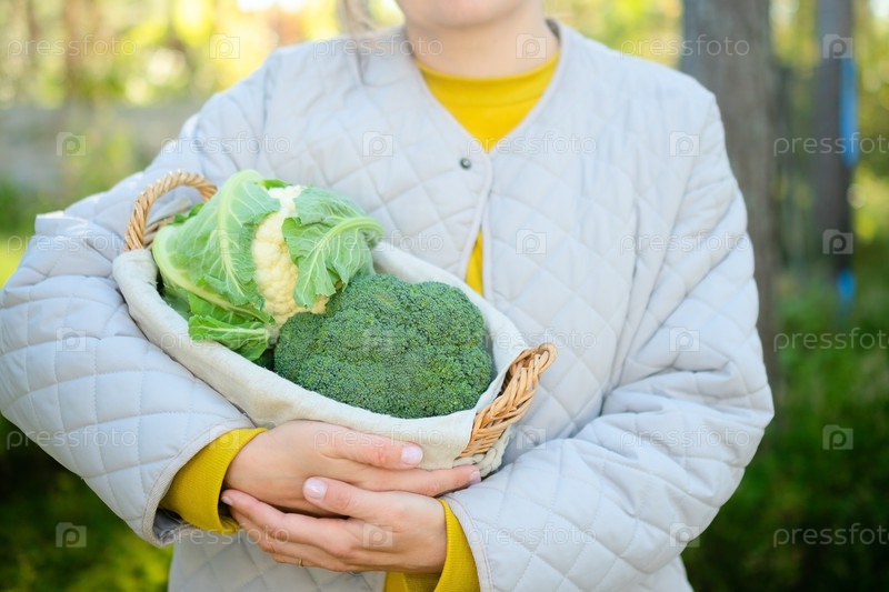 Веселый фермер держит в руках плетеную корзину из цветной капусты и брокколи
