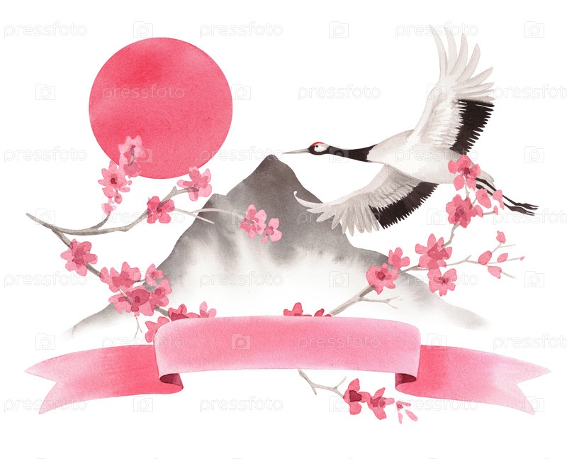 Сакура с летающим японским краном, розовой лентой и пейзажем на заднем плане. иллюстрация ручной акварели. для ткани, обоев, поздравительных открыток, дизайна, декорации и иллюстраций