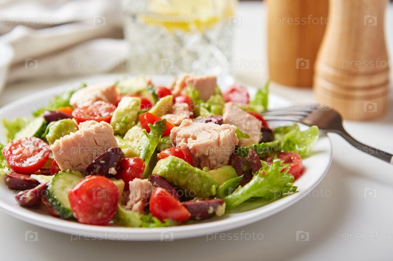 Салат с тунцом, листьями салата, огурцами, помидорами, маслинами и авокадо на белой тарелке на столе