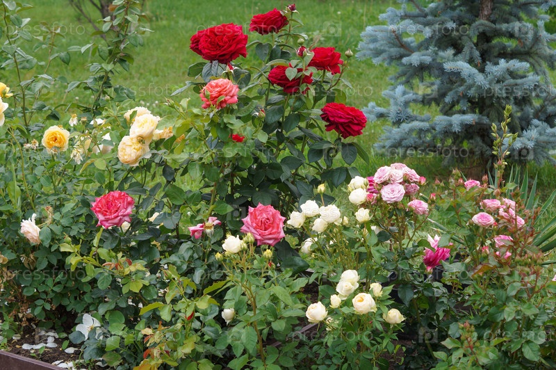 Цветочный сад с разноцветными сортами роз на фоне зеленой лужайки и голубой елей