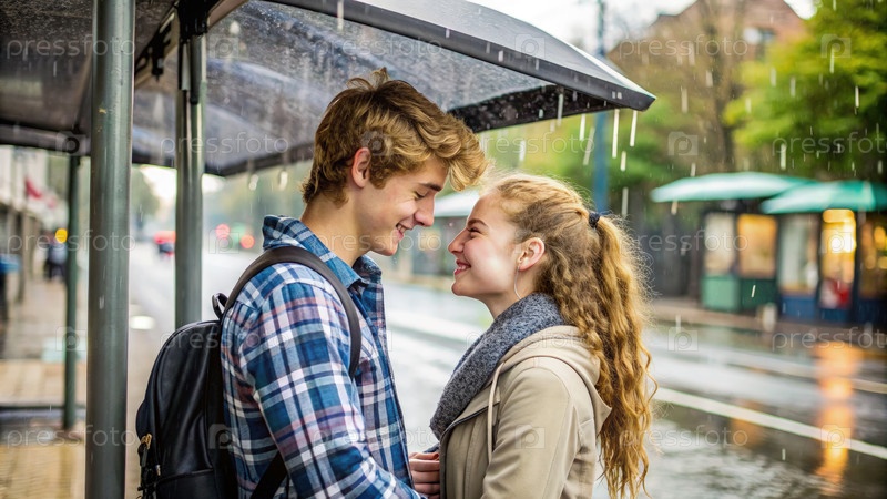 Подростки делятся нежным моментом под автобусной остановкой в дождливый день