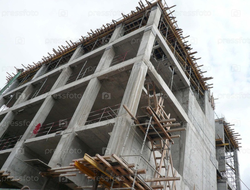 На изображении показан процесс строительства многоэтажного здания с использованием монолитного железобетонного каркаса.На фото показана конструкция бетонных колонн и потолков.Активно используется деревянная облицовка и скелеты