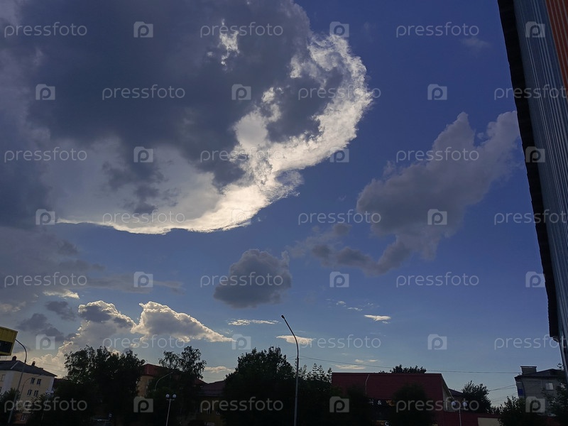 Ярко-синее небо с облаками и намек на закат, рассматриваемый с городской улицы поздним вечером