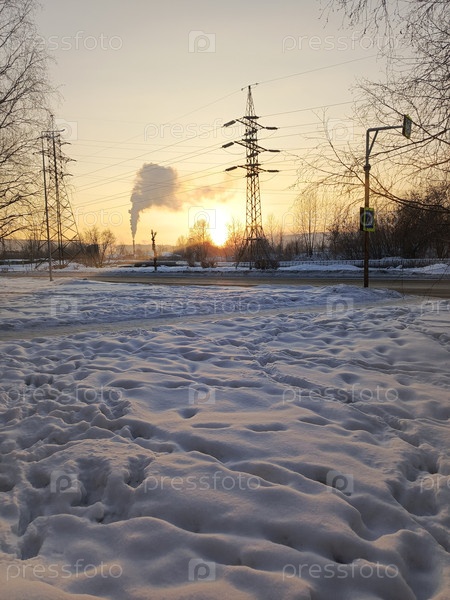 Снежный ландшафт на закате солнца возле промышленной зоны с линиями электропередач и дымом