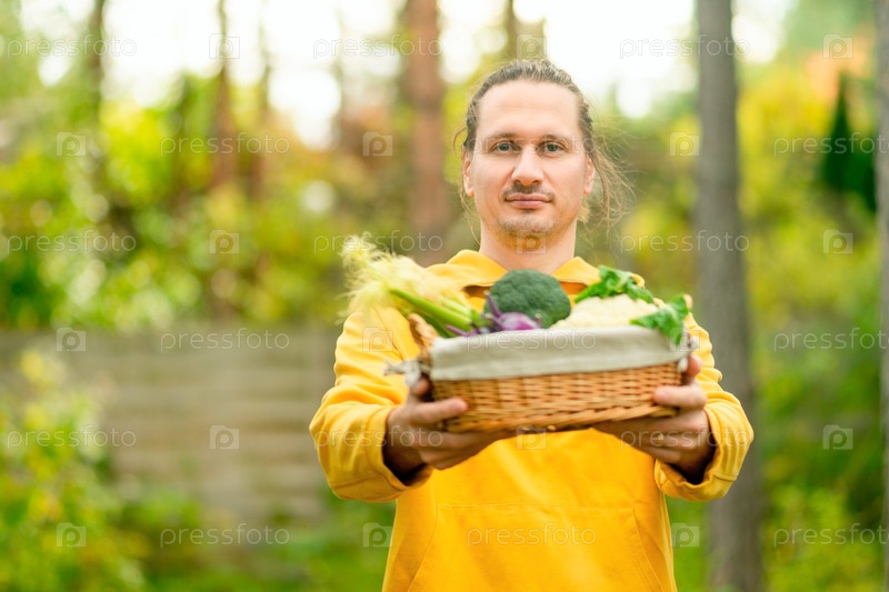 Улыбающийся фермер держит корзину с сезонными овощами