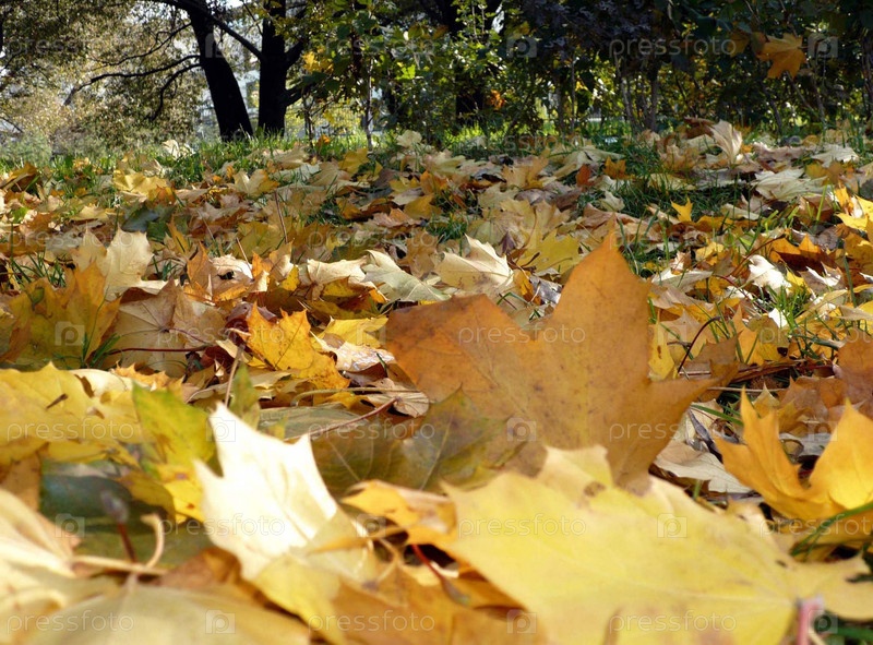 Осенний пейзаж с упавшими желтыми кленовыми листьями на траве