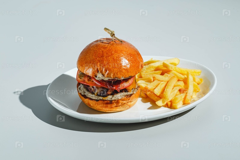 Апетит сочный бургер и картофель фри на светлом фоне.Твердый свет, глубокая тень