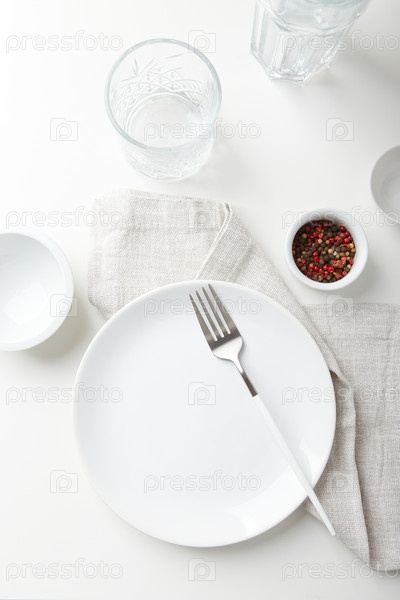 Пустая белая тарелка с вилкой и маленькими мисками на светлом фоне