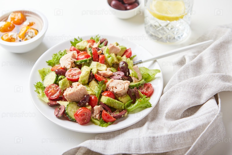 Салат с тунцом, листьями салата, огурцами, помидорами, маслинами и авокадо на белой тарелке на столе
