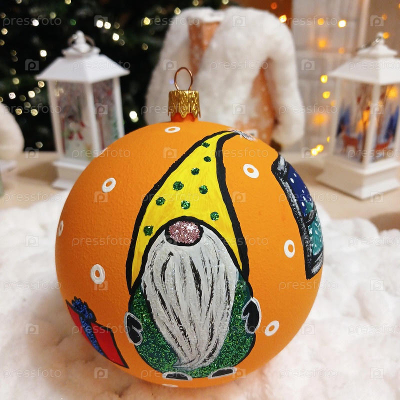 Рождественские шарики для украшения рождественской елки или интерьера. Красивые шары на фоне рождественской ёлки с светящейся гирляндой. Карлики с бородой и шляпой улыбаются в канун Нового года