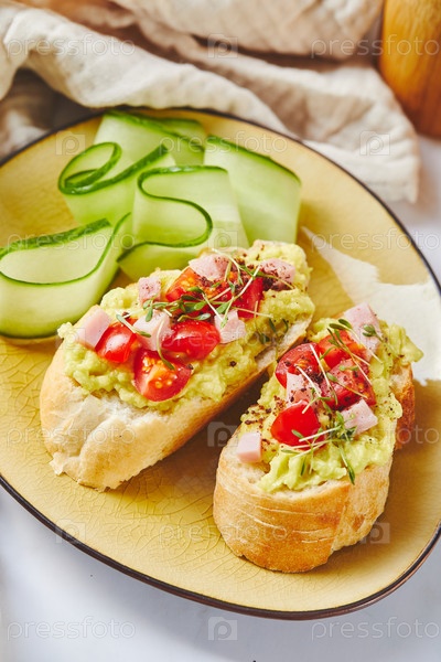Кростини или брюскетта с смягченным авокадо, ветчиной и томатами