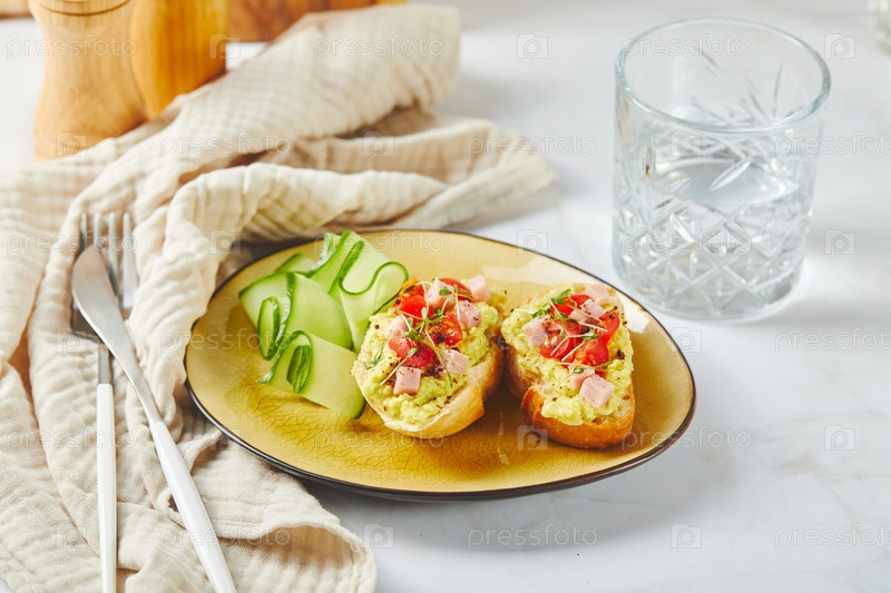 Кростини или брюскетта с смягченным авокадо, ветчиной и томатами