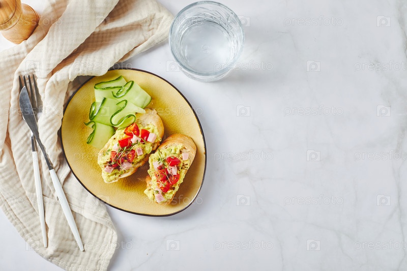 Кростини или брюскетта с смягченным авокадо, ветчиной и томатами