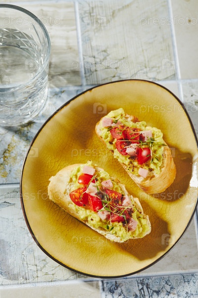 Кростини или брюскетта с смягченным авокадо, ветчиной и томатами