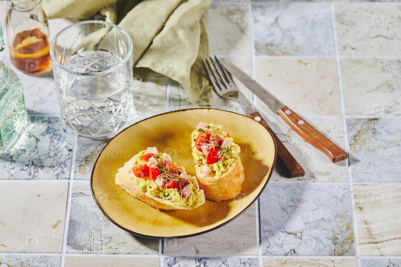 Кростини или брюскетта с смягченным авокадо, ветчиной и томатами