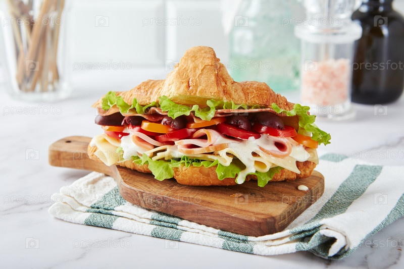 Сэндвич-кроасан с сыром, ветчиной, салатами, помидорами, оливками и вкусным соусом на деревянном доске