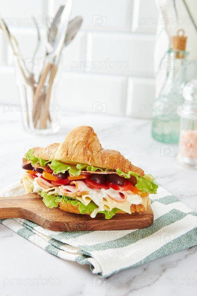 Сэндвич-кроасан с сыром, ветчиной, салатами, помидорами, оливками и вкусным соусом на деревянном доске