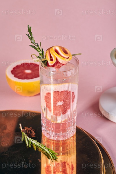 Холодный алкогольный или безалкогольный коктейль со льдом, грейпфрутом и розмарином
