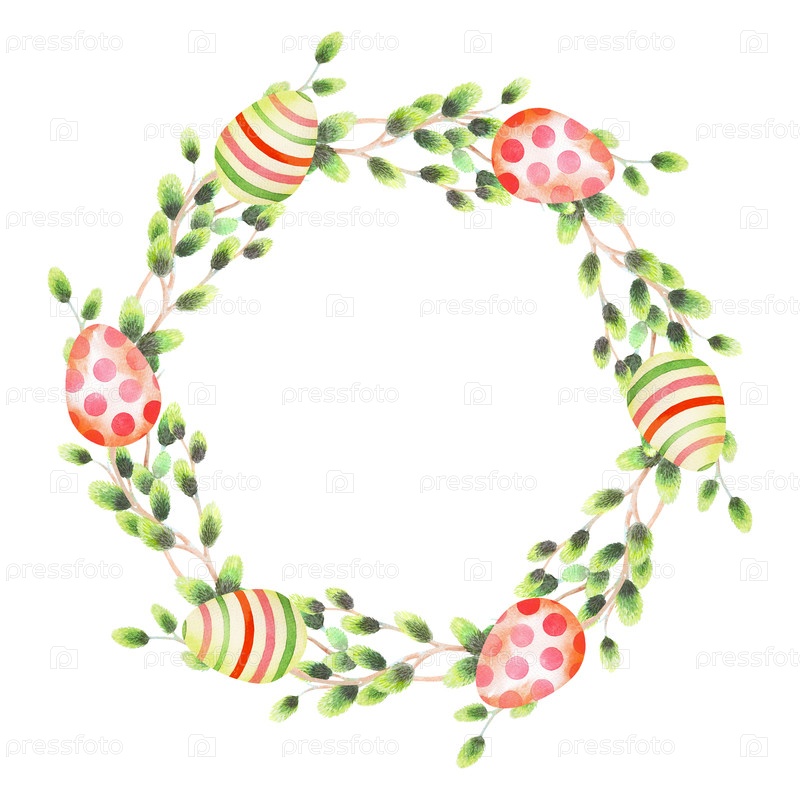 Венок из верби и пасхальных яиц. Иллюстрация сделана вручную акварелью. Подходит для ткани, обоев, упаковочной бумаги, поздравительных открыток, дизайна, декорации и иллюстраций
