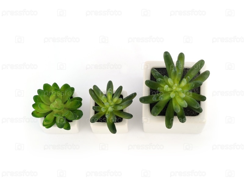 Ботанические реплики суккулентов в белых горшках, изолированные на белом фоне
