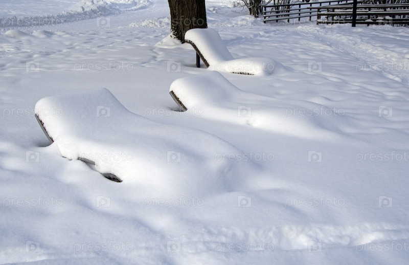 Не сезон - шезлонги в парке, покрытые свежим снегом Теплостанский лесной парк, Москва. январь