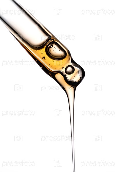 Макроснимка вязкой янтарной сыворотки, падающей из стеклянной пипетки