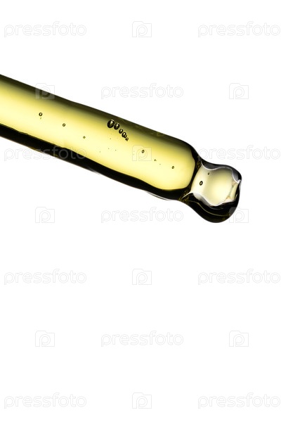Стеклянный капельник, наполненный натуральным золотисто-желтым эфирным маслом или сывороткой для лица на полностью белом фоне. подчеркивает чистоту, жидкую текстуру и одну падающую каплю