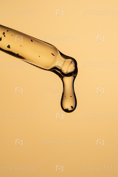 Закрытие стеклянной косметической пипетки каплей желтого эфирного масла, сывороточной или жидкого геля на бежевом или золотом фоне. Концепция ухода за кожей, красоты и спа