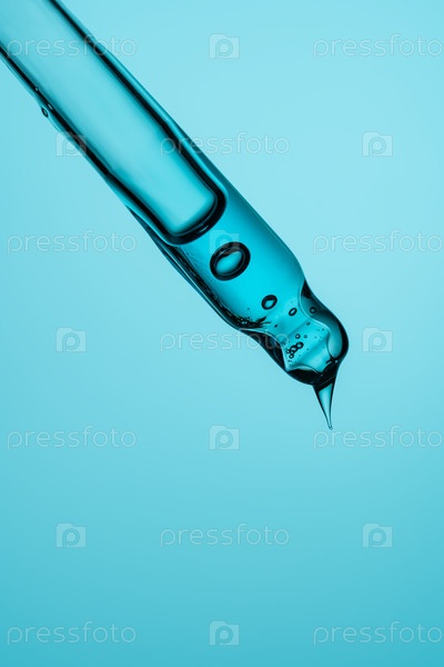 Прозрачная стеклянная капля, заполненная голубым жидким гелем или сывороткой молока, с внутренними пузырями воздуха и каплей на кончике на соответствующем фоне.Фокусируйтесь на уходе за кожей, науке и гидратации