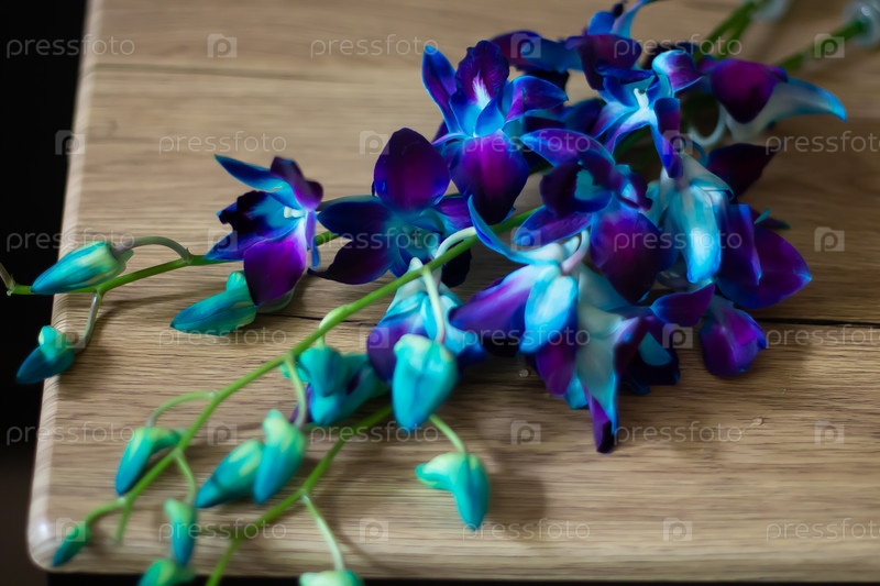 Неоно-синие орхидеи в мягком свете на деревянном фоне