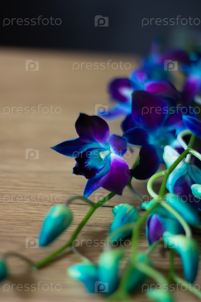 Неоно-синие орхидеи в мягком свете на деревянном фоне
