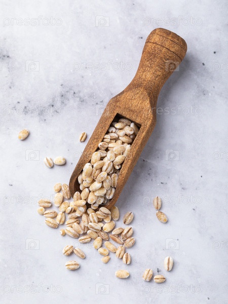 Жемчужная ячмень в деревянной ложке на столе, вид сверху, подлинная фотография, а не искусственный интеллект