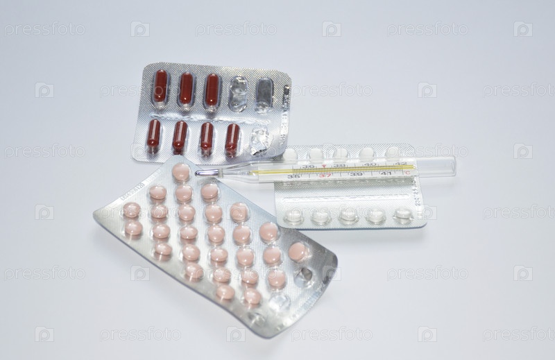 Таблетки, термометр и капсулы на белом фоне. лечение простуды и вирусных заболеваний. сезон болезни. профилактика и лечение. антибиотики и витамины