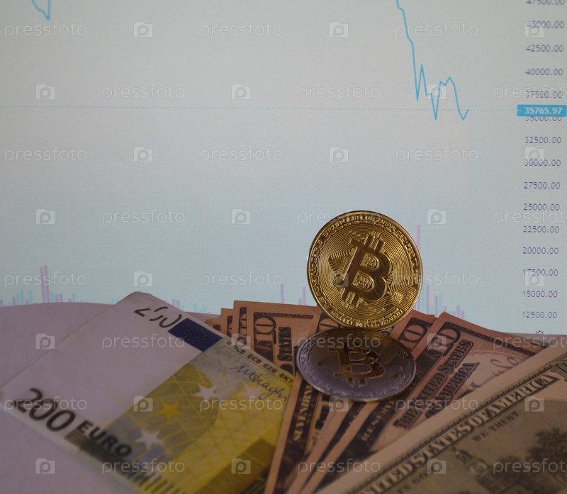 Золотая монета Bitcoin на долларовых купюрах в фоне графика