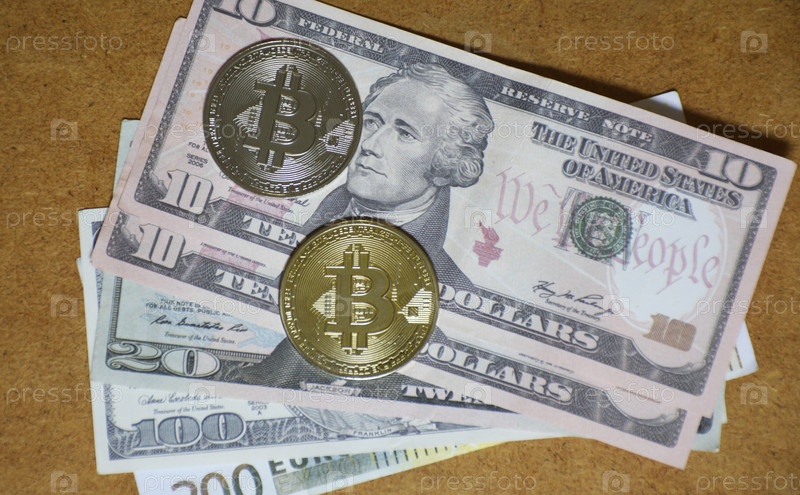Две биткойн-монеты и долларовые купюры на деревянном фоне