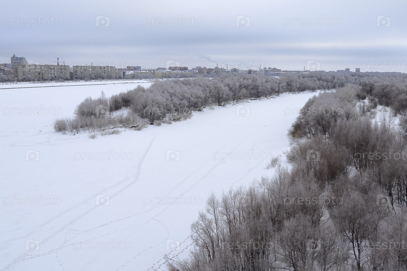 Зимний вид города Омска на берегу реки Иртыш