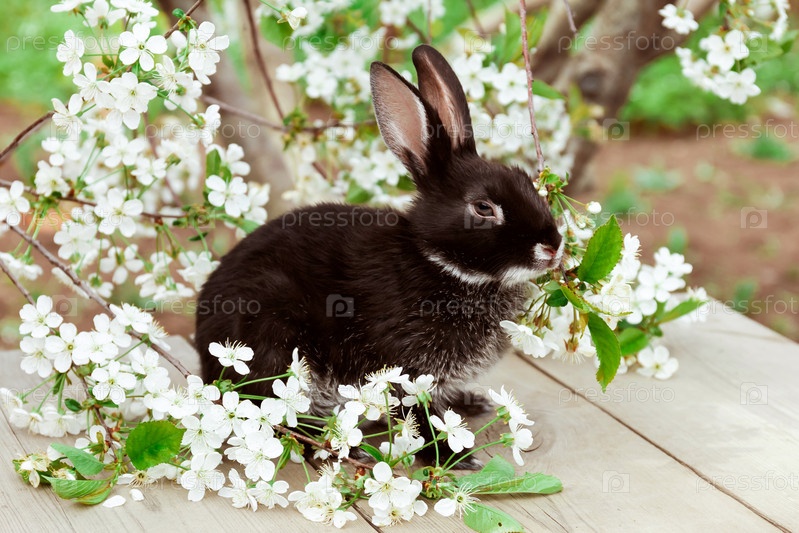 Черный кролик сидит бок о бок среди цветов вишни