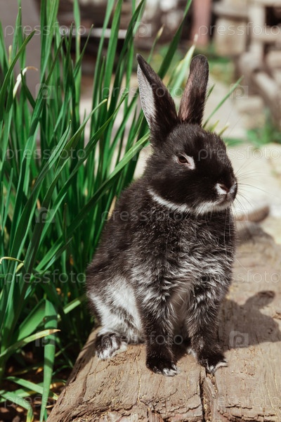 Черно-белый кролик сидит на деревянных досках возле зеленой травы