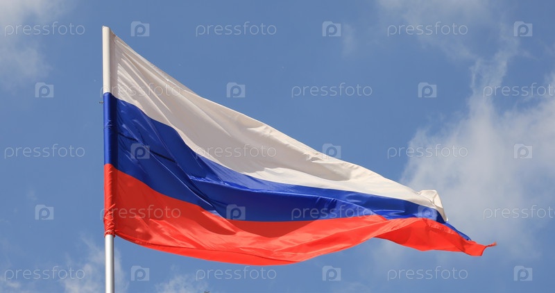 Российский флаг развевается на голубом небе