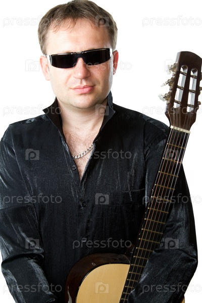 Гитарист с акустической шестиструнной гитарой изолирован на белом фоне