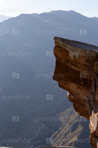Пейзаж захода солнца плоской длинной скалы, называемой Goor Troll Tongue, над пропастью глубокого горного ущелья на Северном Кавказе, Дагестан, популярное место, активно посещаемое туристами и путешественниками