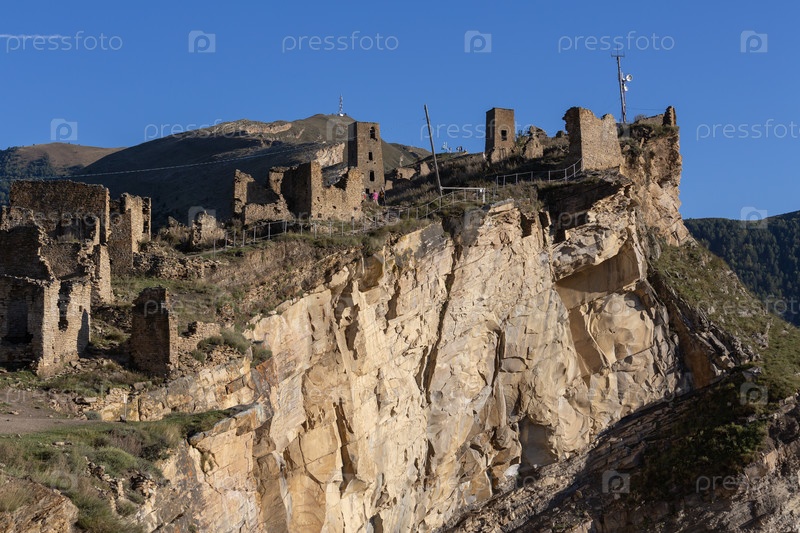 Пейзаж древних средневековых башен и домов деревни Гура, разрушенная заброшенная дагестанская деревня, расположенная на вершине скалы в Кавказских горах, популярное место, активно посещаемое туристами